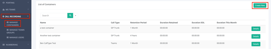 3.1.2. Go to Call Recording -> Manage Container section on the menu on the left and click on ‘Create New’ <see below>