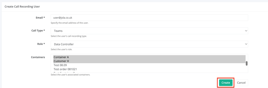 3.3.2. Type the email address of the person you want to grant the access to Call Recording Platform, choose what role you want to give to them and to select containers they should have access to. ‘Data Controllers’ are the only type of users who can have access to more than a one container. Click ‘Create’ button.