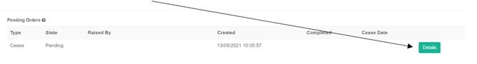 In the Orders Tab, select Details next to the Cease order