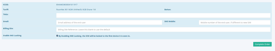 IMEI locking can be enabled for live Multinet, RoamNet 901 and EE SIMs via the Orders Tab on the SIM Dashboard: