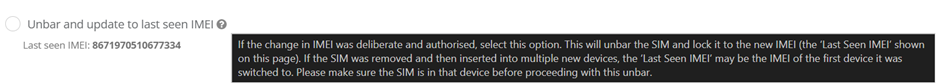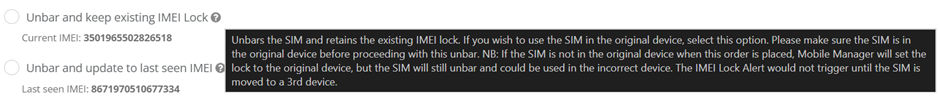 N.B. If this unbar option is selected while the SIM is not in the original device, the IMEI Locking Bar will not trigger again unless the SIM is used in another (i.e. 3rd)device. This means that the SIM could use data in the 2nd device while showing as locked to the original device on Mobile Manager. We advise that the SIM is moved back into the original device before unbarring with this option. The tool tip in Mobile Manager next to