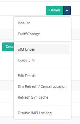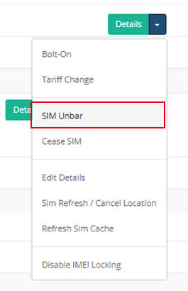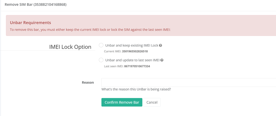 2. Unbar and update to last seen IMEI should be selected if you wish to continue using the SIM in the new device. The SIM will be unbarred and the lock will be updated to the IMEI of the new device.
