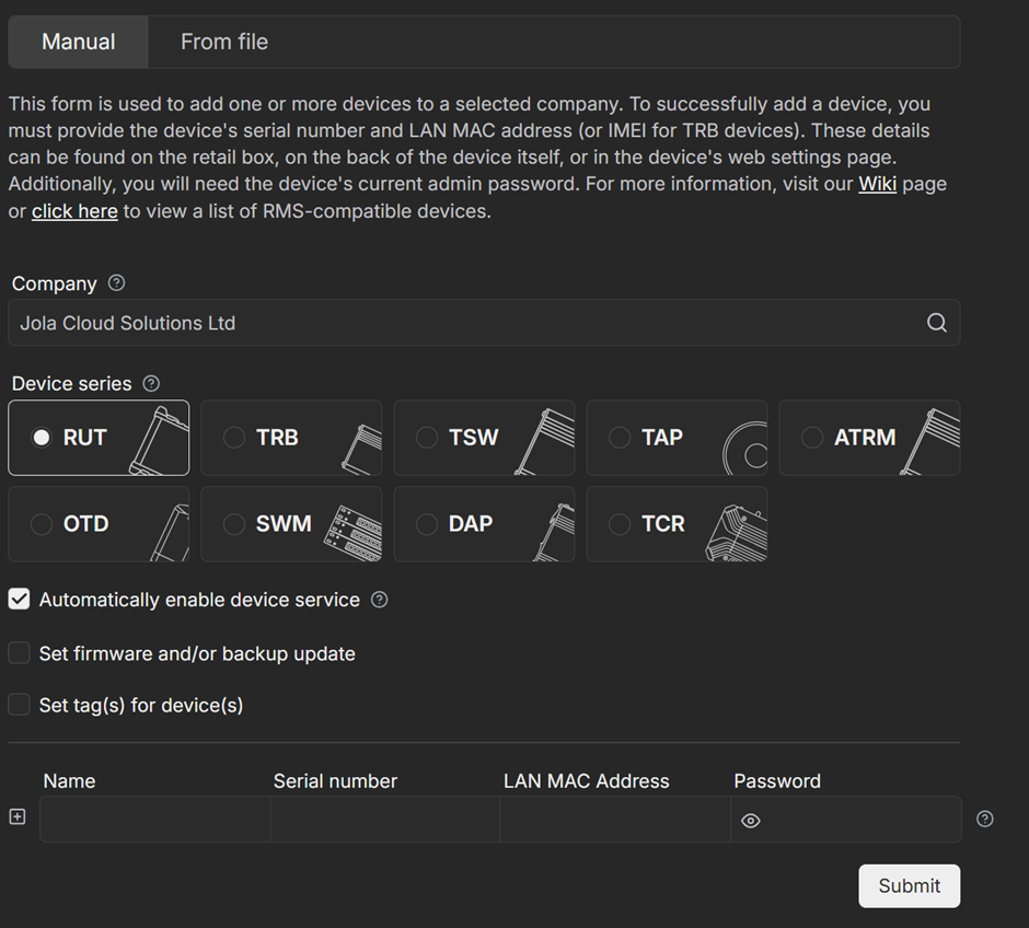 Then hit submit the device will be added into your platform as long as the device is online it should register within a few hours.